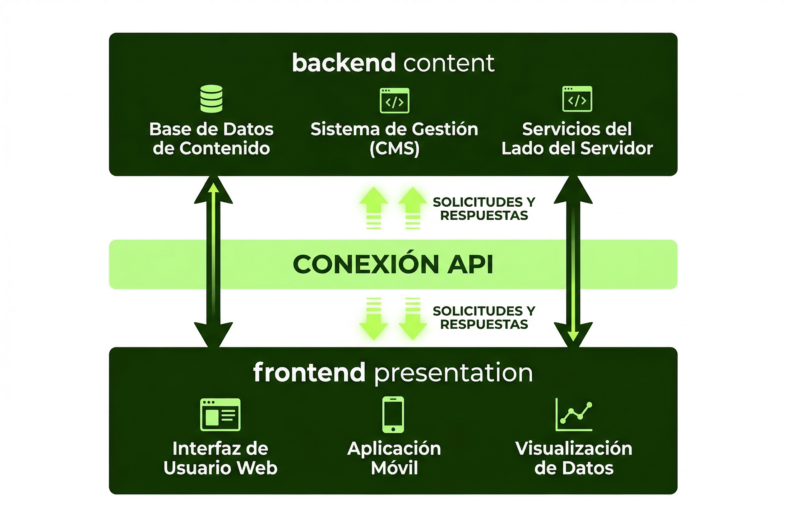 API (capa de comunicación). Conecta el backend con cualquier canal de salida. Los dos estándares principales son REST y GraphQL. Cuando el frontend necesita contenido, envía una petición a la API, que responde con los datos solicitados en formato JSON.