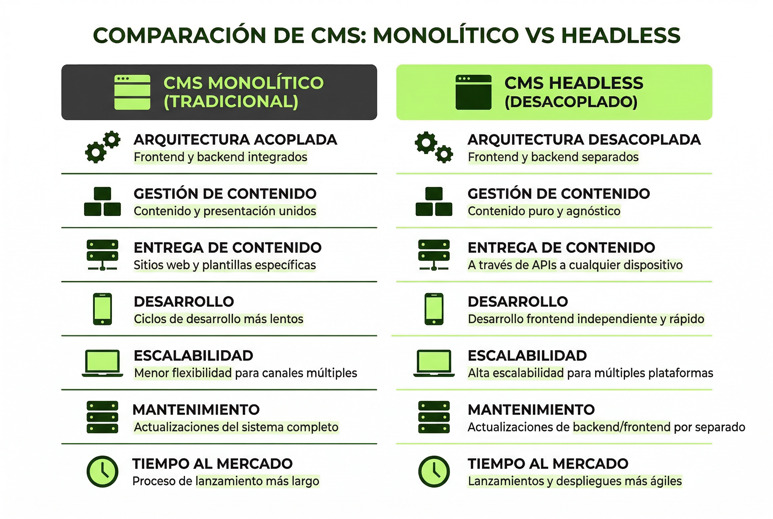 La diferencia principal es la arquitectura: un CMS tradicional es monolítico (backend y frontend están unidos), mientras que un CMS headless los separa completamente. Esta diferencia técnica tiene consecuencias directas en 7 dimensiones que afectan a cualquier proyecto web profesional.