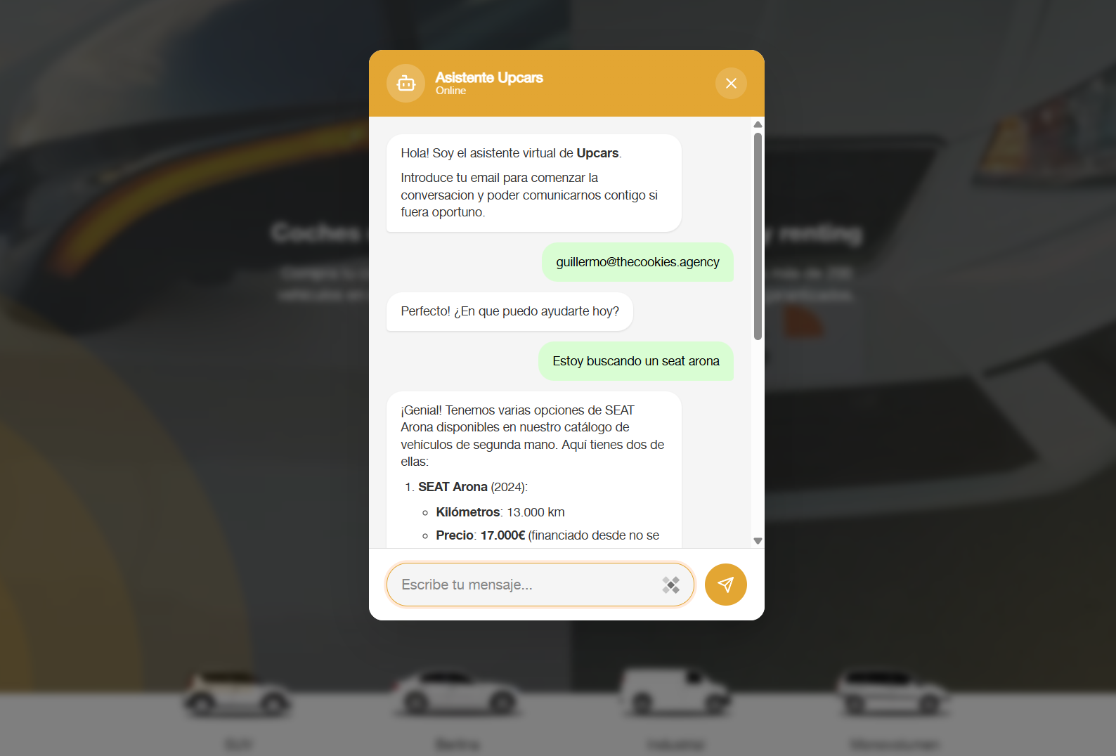 El trabajo técnico clave aquí fue conseguir que el asistente hablase en tiempo real con la base de datos del proyecto. Que cuando un usuario pregunta por un Volkswagen Polo de gasolina, la respuesta no sea genérica sino que esté basada en el inventario actual de Upcars. Eso requiere integración real, no simplemente enchufar una herramienta de terceros y esperar que funcione sola.