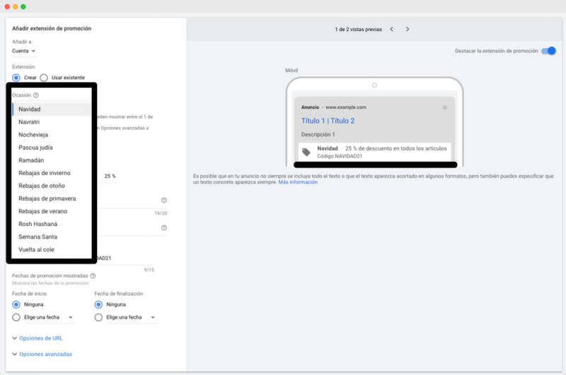 Y no te olvides de programar el inicio y fin de las extensiones de promoción. No quieras mostrar en tus anuncios las rebajas de verano todo el año.