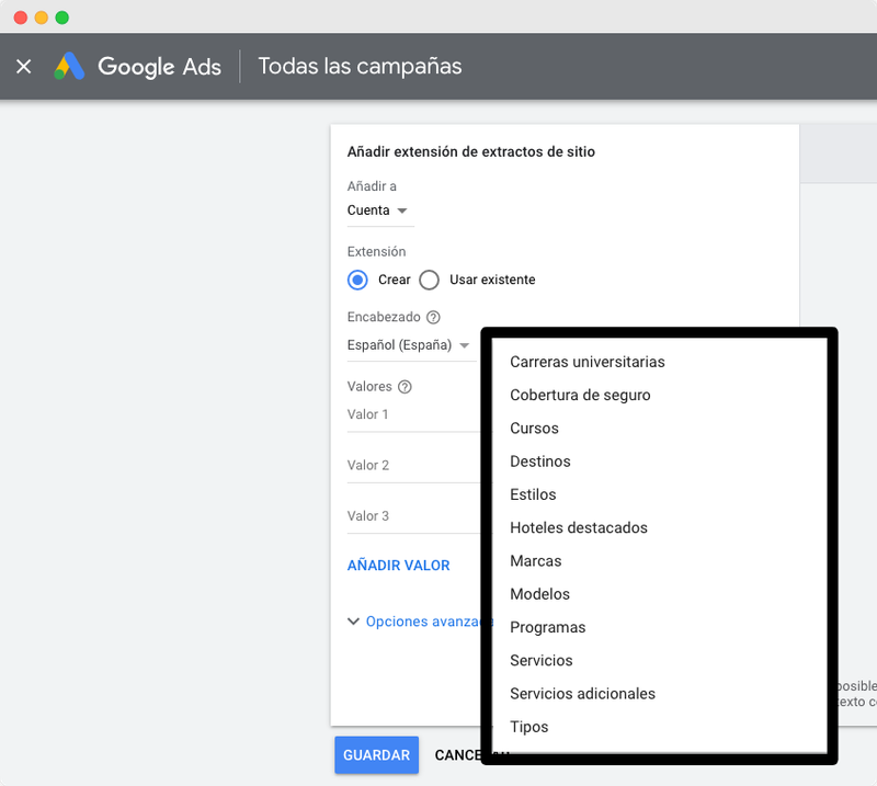 Las extensiones de extracto de sitio se basan de un encabezado (dado por google ads) y una serie de valores.