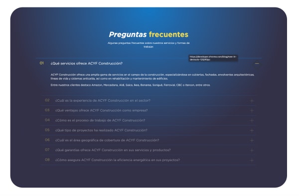 Fueron varios los retos al desarrollar el portal web de ACYF Construcción. Desde entender la estructura empresarial con sus diferentes líneas de negocio, la conexión entre todas como el de establecer un rediseño limpio a la vez que moderno dentro del sector de la construcción.
